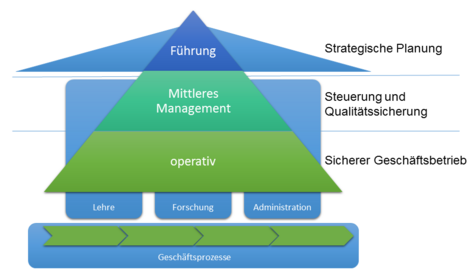 Daraus können die drei Geschäftsbereiche Lehre, Forschung und Verwaltung abgeleitet werden, innerhalb derer Geschäftsprozesse in die drei Kategorien eingeordnet werden können: