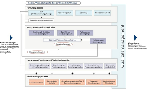 An der Hochschule Offenburg können die in der Abbildung genannten Hauptgeschäftsprozesse identifiziert werden, welche sich in mehrere Untergeschäftsprozesse untergliedern können, welche wiederum in mehreren Prozessen eingesetzt werden können.