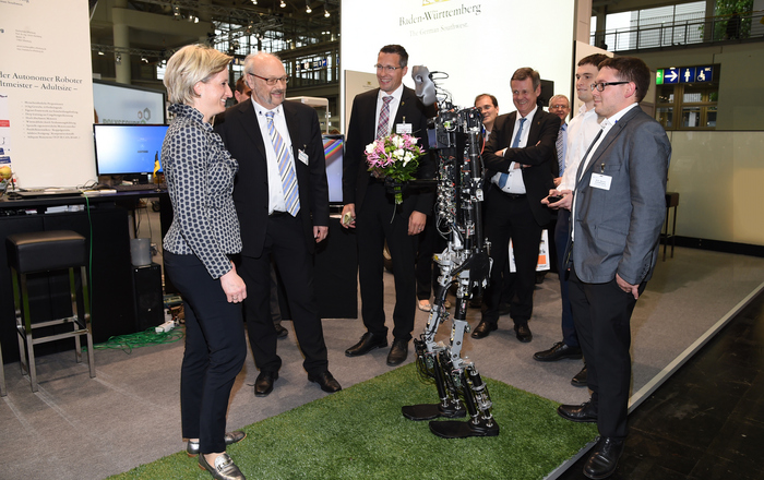 Sweaty, humanoider Roboter und Vizeweltmeister der Hochschule Offenburg, hat Einsatz auf der Hannover Messe 2017 erfolgreich absolviert.
