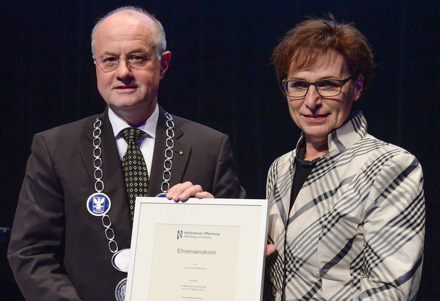 Besondere Ehre wurde Dr. Wolfgang Bruder, dem ehemaligen Offenburger Oberbürgermeister und langjährigen Vorsitzenden des Hochschulrats, und der amtierenden Oberbürgermeisterin Edith Schreiner zuteil: Bruder wurde mit der Ehrenbürgerwürde der Hochschule ausgezeichnet, Edith Schreiner mit der Ehrensenatorwürde. Ehrenbürgerwürde und Ehrensenatorwürde werden an Persönlichkeiten verliehen, die sich besondere Verdienste um die Hochschule erworben haben, Hochschulrektor Winfried Lieber würdigte das Engagement Schreiners und Bruders für die Hochschule in seiner Laudatio. Bisher hat die Hochschule Offenburg acht Ehrenbürger, zuletzt wurde Unternehmer Martin Herrenknecht vor zwei Jahren zum Ehrenbürger ernannt. Als Ehrenbürger ist Wolfgang Bruder, der bereits auch Ehrensenator ist, nun ständiges Mitglied der Hochschule. Die Würde der Ehrensenatorin erhält Edith Schreiner für ihr außergewöhnliches und herausragendes Engagement zum Wohle des Hochschulstandorts Offenburg. Damit ist sie die erste Frau, die an der Hochschule Offenburg die Ehrensenatorwürde erhält - auch sie ist nun ständiges Mitglied der Offenburger Hochschule.