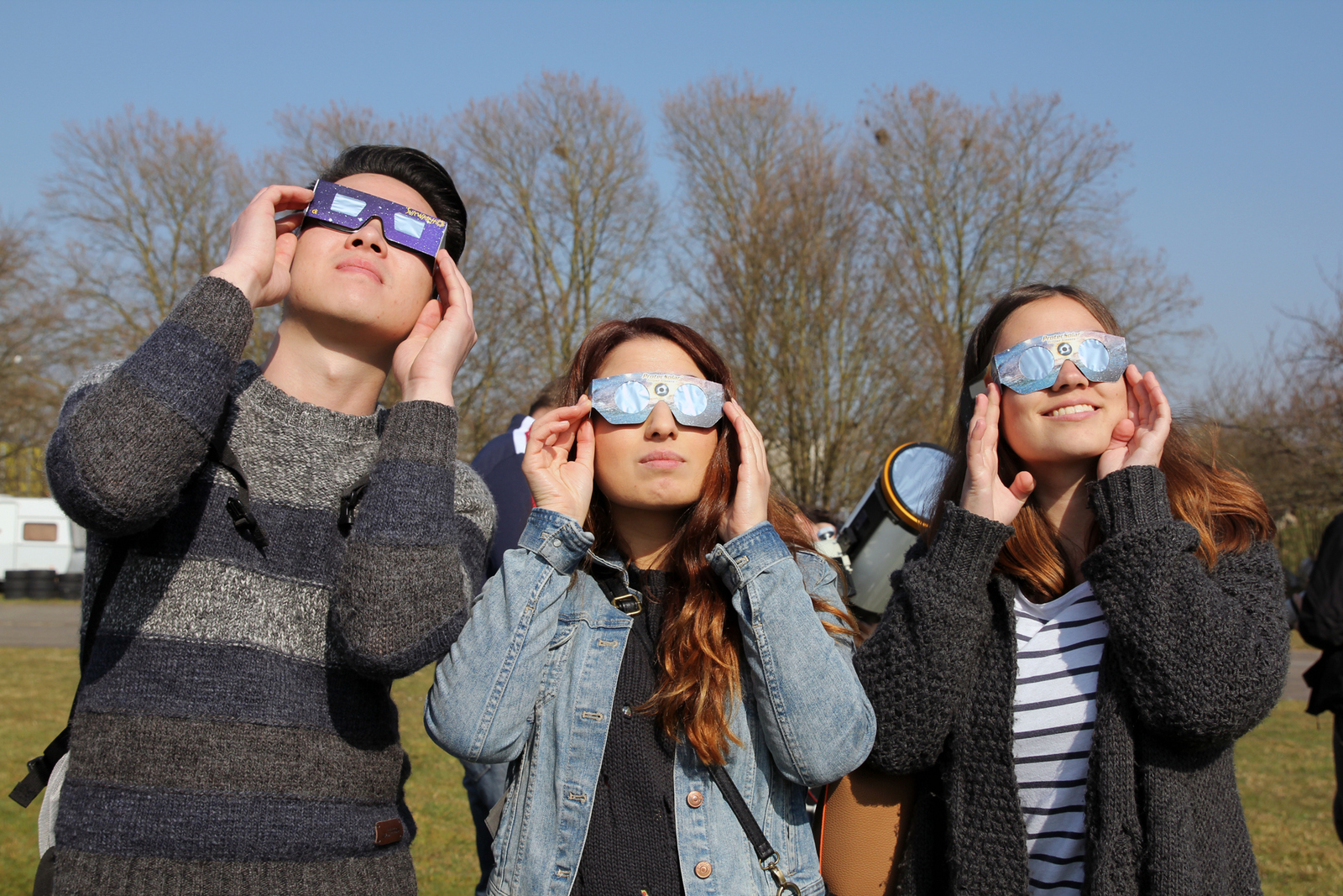 Geschützter Blick in die Sonne: Die Studierenden Viet, Sevda und Theresa haben drei der begehrten Brillen ergattert. // Bild: sg