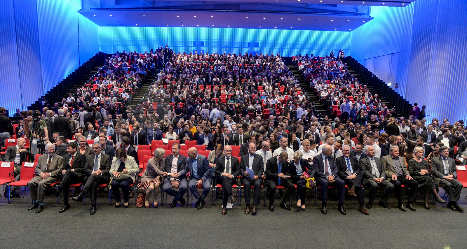Rund 970 Gäste kamen am Freitagabend zur Hochschulfeier in die Oberrheinhalle. Rektor Prof. Dr. Winfried Lieber (1. Reihe, 8. von links) konnte dazu auch Landesverkehrsminister Winfried Hermann (1. Reihe, 7. von links) und den Grünen-Landtagsabgeordneten Thomas Marwein (1. Reihe, 6. von links) begrüßen.//Foto: Martina Wagner