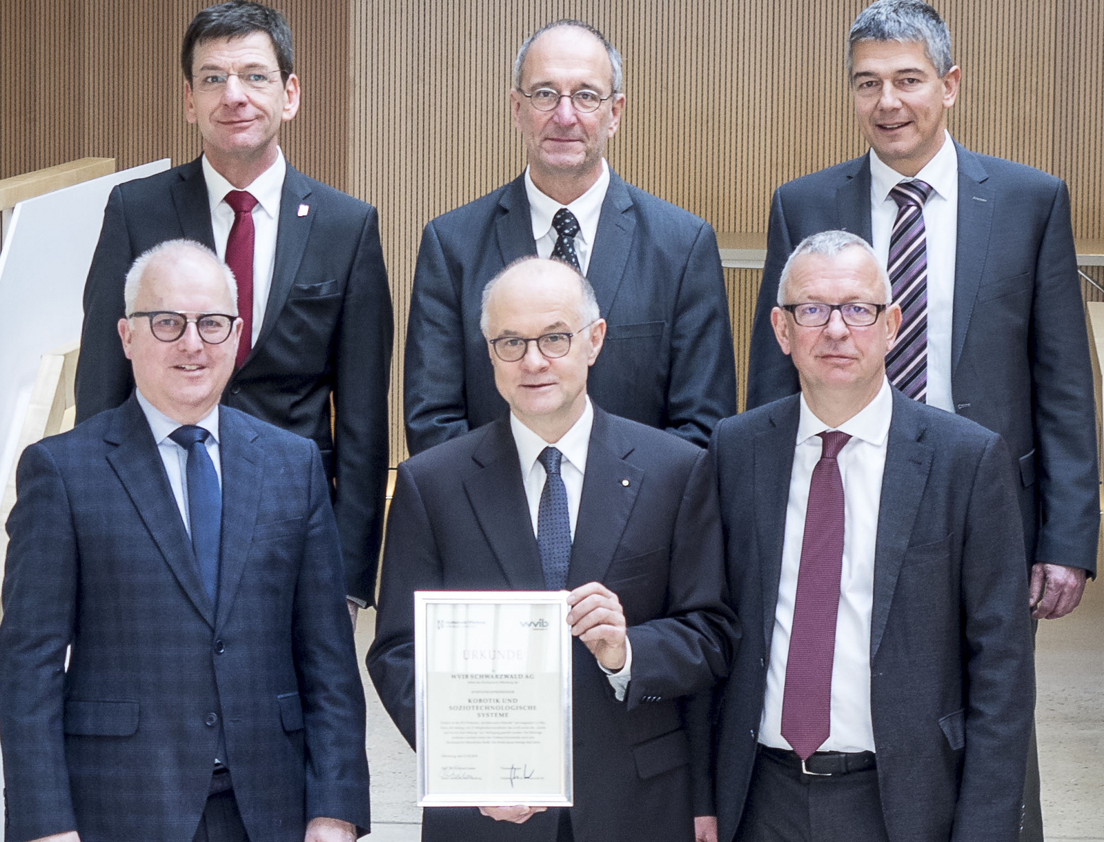 Stifter des wvib übergeben die Stiftungsurkunde. vlnr.: Thomas Burger, wvib, Rektor Winfried Lieber, Christoph Münzer, wvib. Hinten: Gerhard Kachel, Prorektor, Matthias Haun, Prof. für Kognitive Kybernetik, Gerrit Christoph, Leiter Technologie wvib