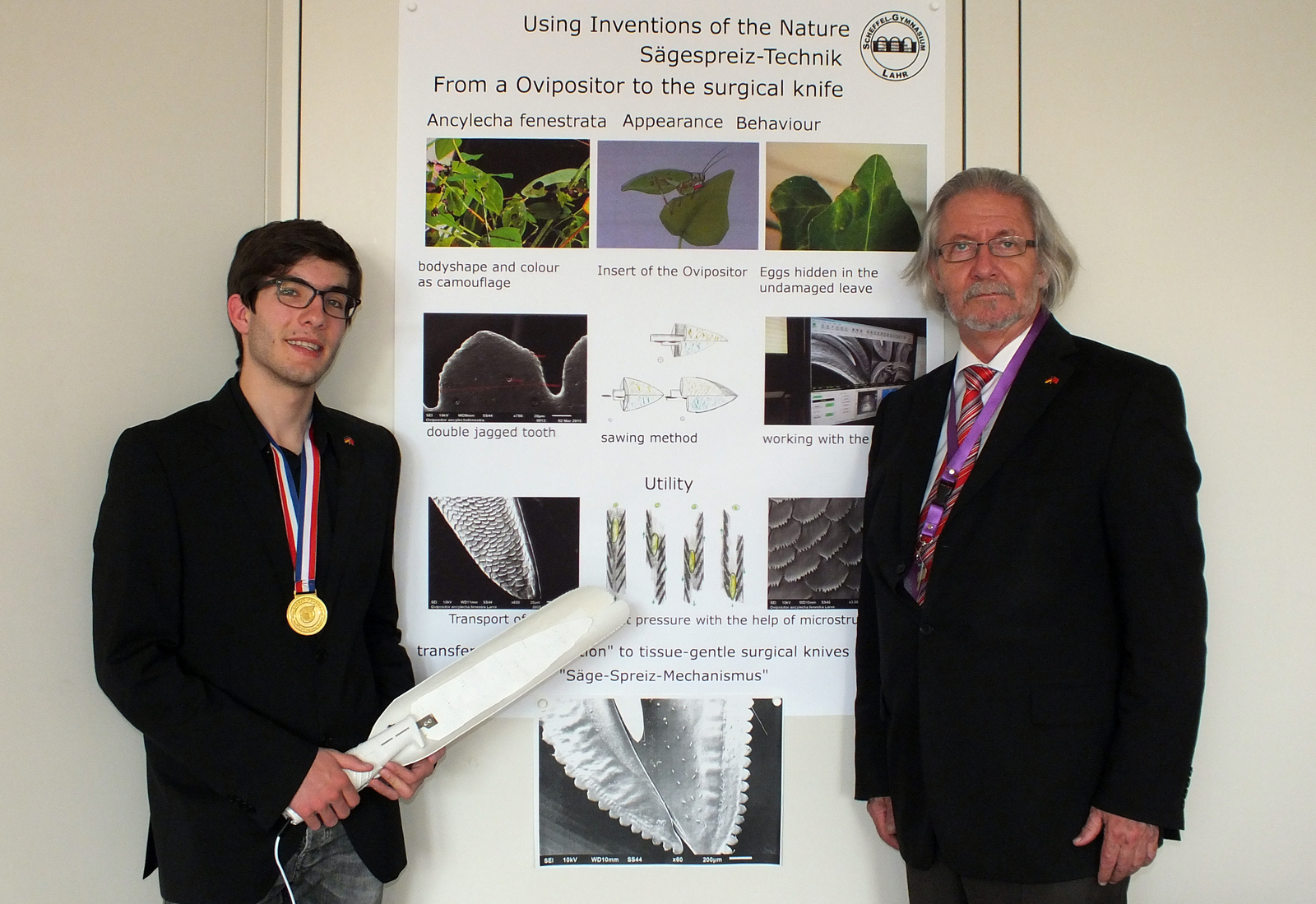 Es waren vor allem die Aufnahmen des Rasterelektronenmikroskops (REM), mit denen die Nachwuchsforscher des Lahrer Scheffel-Gymnasiums in der chinesischen Hauptstadt Peking auf sich aufmerksam machten. Für einen wissenschaftlichen Wettbewerb in China hatten sie sich den "Säge-Spreiz-Mechanismus" der Malaysischen Blattschrecke ausgesucht. Die Tiere legen ihre Eier in Blätter, ohne dabei das Gewebe der Pflanzen zu verletzen. Diesen Mechanismus hat sich das Team um den 17 Jahre alten Dominik Werz abgeschaut, als Vorbild für ein chirurgisches Messer zur druckfreien Positionierung von Implantaten.