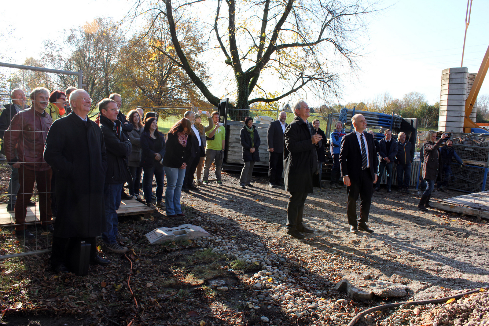 Nach alter Baustellen-Tradition feierten Handwerker, Projektverantwortliche, Professoren, Mitarbeiter und Studierende mit warmen Speisen und kühlen Getränken nach dem Richtspruch die Fertigstellung des Rohbaus. Maurer- und Betonbaumeister Ronny Weissenberg, der bei der Baufirma Rendler arbeitet, sorgte mit seinem Richtspruch für Schmunzeln: "Schade für den schönen Sichtbeton - vor lauter Büchern kommt hernach kein Aug' mehr dran."