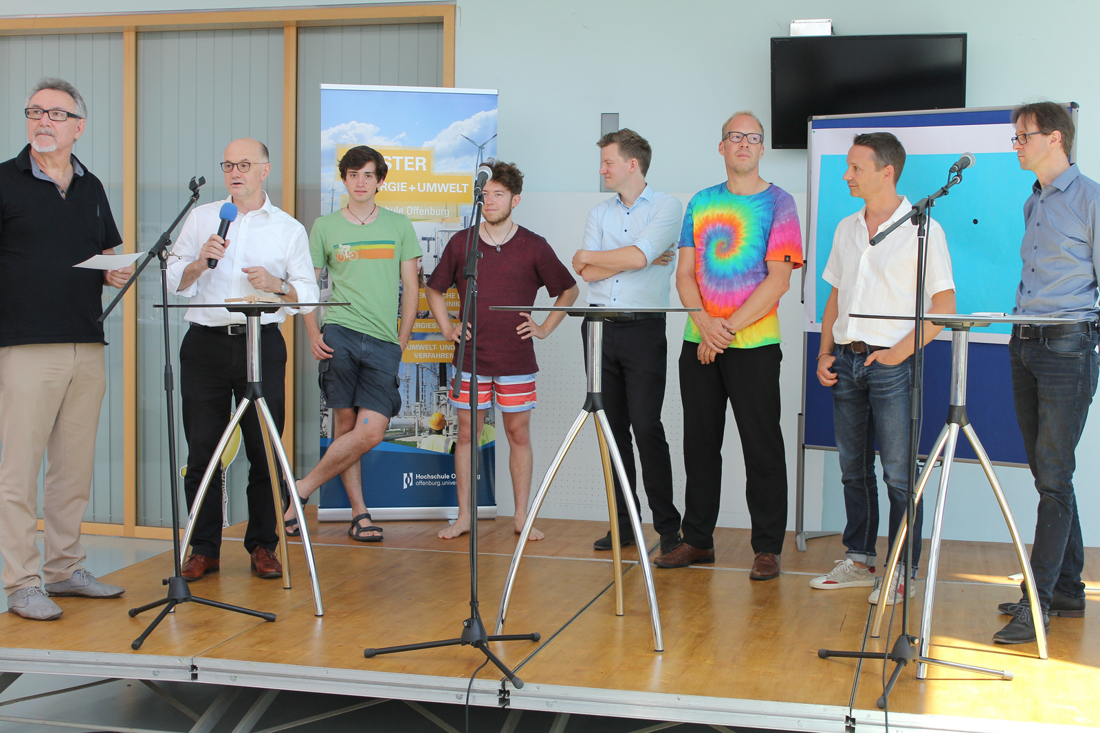 Reges Treiben hat beim Energie Slam im Foyer des Gebäudes D an der Hochschule Offenburg geherrscht. Rund 200 Schülerinnen, Schüler und Erwachsene hörten unter dem Motto „Energiewende? Machen wir!“ den Vorträgen von Prof. Dr. Jens Pfafferott, Prof. Dr. Daniel Kray, Prof. Dr. Wolfgang Bessler und Prof. Dr. Niklas Hartmann zu. Aus Sicht der Gäste positive Aussagen wurden mit La-Ola-Wellen gefeiert, Zeitüberschreitungen der Redner lautstark per Rätsche angezeigt.