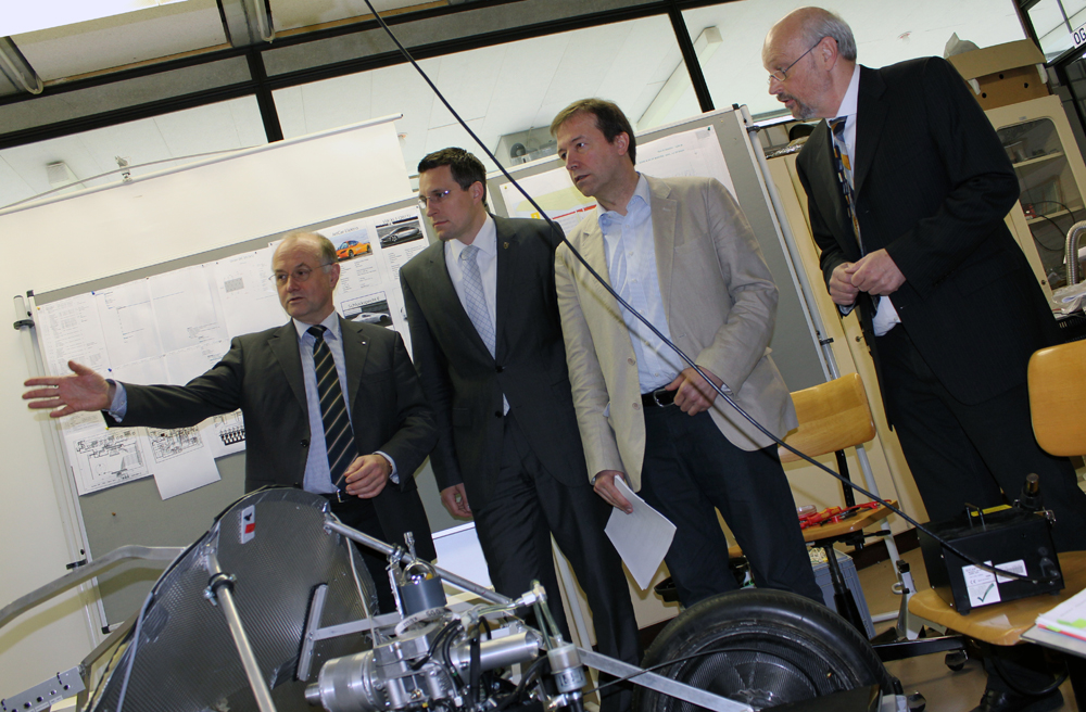 "Hier wird massiv an Zukunftsthemen geforscht", lobte Kai Schmidt-Eisenlohr auch bei einer Stippvisite des Niedrigenergiefahrzeugs "Schluckspecht", das von den Studierenden derzeit wieder für den "Shell Eco Marathon" in Rotterdam flott gemacht wird. Dort geht das Team um Professor Dr. Ulrich Hochberg Mitte Mai wieder an den Start. "Im Bereich der E-Mobilität passiert bei den deutschen Automobilherstellern noch viel zu wenig", sagte der wissenschaftspolitische Sprecher im Gespräch mit Hochschulrektor Winfried Lieber und Thomas Marwein.