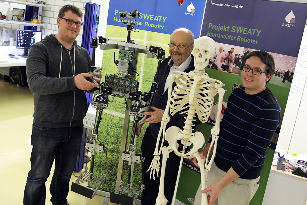 Sweaty, der im vergangenen Sommer bei der Fußballweltmeisterschaft für Roboter in Brasilien in der Kategorie "Humanoide Roboter" aufgelaufen ist, hat einen Trainingspartner bekommen: Stan heißt er und ist ein menschliches Skelettmodell. "Wir möchten noch besser die menschliche Anatomie berücksichtigen", sagt Teamleiter Professor Dr. Ulrich Hochberg, der gemeinsam mit den Professoren Dr. Michael Wülker (Bildverarbeitung) und Dr. Klaus Dorer (Künstliche Intelligenz) das Projekt betreut. Sweatys momentane Hüfte sei zu breit, am Skelett erkenne man genau, dass die menschliche Hüfte viel schmäler sei. "Jetzt ist die Überlegung, dass wir Sweaty ein künstliches Hüftgelenk einbauen, das auch bei Menschen eingesetzt wird." Auch die "Muskeln" lässt Sweaty in diesem Sommersemester spielen: Er bekommt dickere Karbonrohre, die sein Skelett massiver und den Roboter schwerer machen. Im Vergleich zu seinen Anfängen hat sich sein Gewicht verdoppelt - er bringt jetzt zwölf Kilogramm auf die Waage. "Sweaty wird deutlich schwerer - und damit auch stabiler", sagt Manuel Scharffenberg, der im zweiten Semester den Maschinenbau-Master studiert und seit den Anfängen in dem Projekt mitarbeitet. Lucas Schickl, der im sechsten Semester den Bachelor in Maschinenbau studiert und eine Ausbildung als Systemelektroniker hat, unterstützt das Team: "Roboter sind einfach Jungsträume", sagt er schmunzelnd. Schon früher hat er an Lego-Robotern geschraubt - jetzt ist es ein echter. "Wir würden uns im Sommersemester aber noch über studentischen Zuwachs freuen - Sweaty ist ein klasse Projekt, in dem so viele Disziplinen zusammenkommen und in dem man unglaublich viel lernen kann", sind sich die beiden einig. In dem Projekt können Studierende das in der Theorie gelernte Wissen in die Praxis umsetzen und durch eigene kreative Ideen ergänzen.