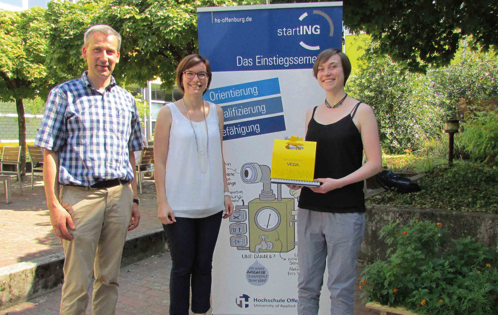In diesem Sommersemester haben 20 Studierende die maximale Credit-Punktzahl von 30 Credits erreicht. Eine Studierende hat sich aber besonders hervorgetan: Mona Bukenberger hat das Einstiegssemester mit der Gesamtnote 1,1 abgeschlossen. Sie erhielt einen Preis, der von der Firma VEGA Grieshaber in Schiltach gestiftet und von Loreen Kammerer überreicht wurde.