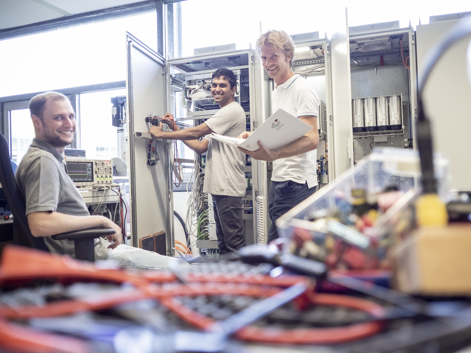 Im Labor für elektrische Antriebe und Leistungselektronik herrscht geschäftiges Treiben: Vor wenigen Tagen wurden riesige Schaltschränke angeliefert, vollgepackt mit Elektronik für den Betrieb von Elektromotoren mit einer maximalen Leistung von 350 kW. Ein Team aus Spezialisten nimmt die Schaltschränke gerade in Betrieb. Die Motoren, die sie speisen, sind dafür vorgesehen, in Kraftfahrzeugprüfständen für die realitätsnahe Belastung der zu untersuchenden Fahrzeuge oder deren Komponenten zu sorgen. "Heutzutage beginnt der Test von Fahrzeugkomponenten wie Motor, Getriebe und Antriebsstrang lange, bevor das Fahrzeug als Ganzes zur Verfügung steht", erklärt Prof. Uwe Nuß, Projektleiter seitens der Hochschule. Dabei müssen immer kompliziertere Fahrsituationen auf Prüfständen so wirklichkeitsgetreu wie möglich nachgestellt werden.