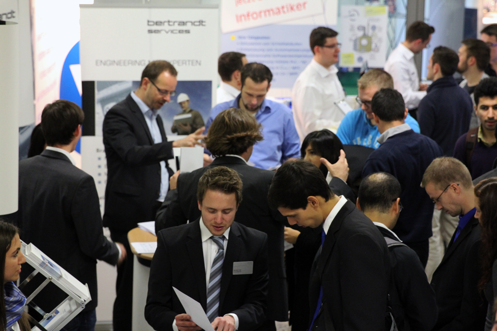 Die Fotos für ihre Bewerbungsschreiben konnten sich die Studierenden auf dieser Recruiting-Messe zum ersten Mal direkt auf dem Campus schießen lassen. Das hauseigene Career Center hatte über "Peter-Schmidt-Fotografie" kostenlos professionelle Bewerbungsfotos angeboten - die Nachfrage war groß: Vor dem Fotostudio im Mediengebäude D bildeten sich regelrechte Schlangen.