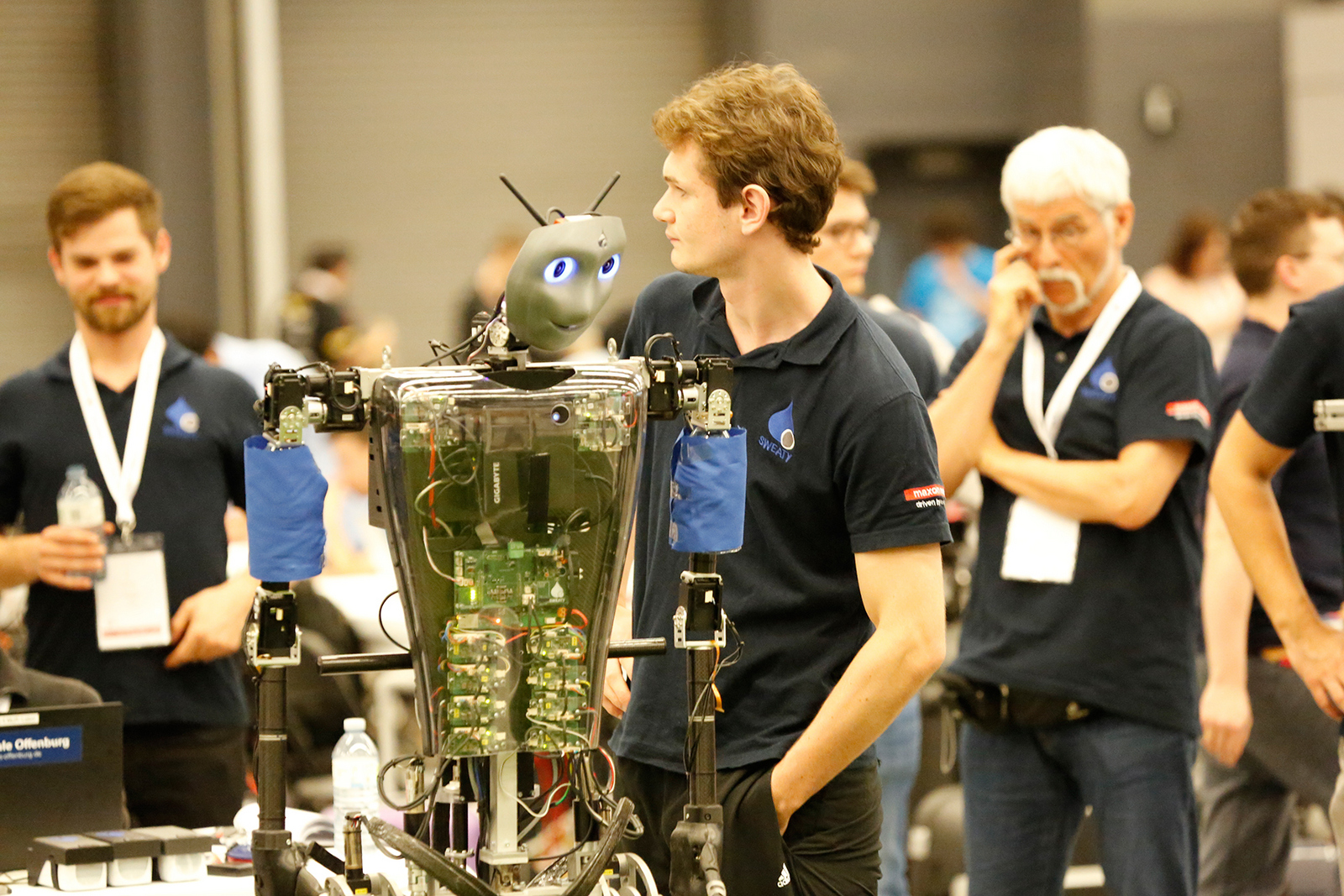 Beim 1. Drop-In Game am Morgen wurde NimbRo als Teampartner von Sweaty ausgelost. Der Weltmeister und Vizeweltmeister ließen den Gegnern (CIT Brains und ZSTT) keine Chance auf ein Gegentor im ersten Drop-In Spiel des Tages. Da beide Roboter lauf- und treffsicher sind, waren sie jeweils eine Halbzeit Torwart bzw. Feldspieler. Damit gehen acht Tore auf das Tandemkonto NimbRo und Sweaty.