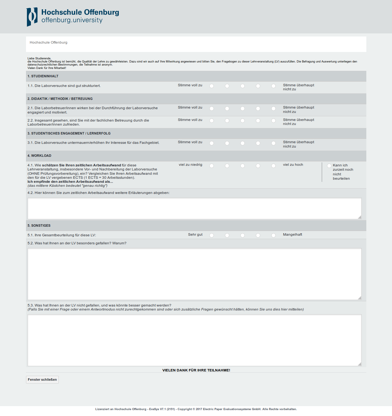 - Freitextfelder für Anmerkungen und Verbesserungsvorschläge.