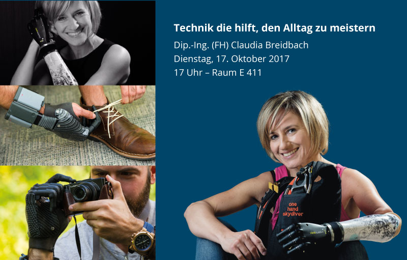 Dipl.-Ing. (FH) Claudia Breidbach, Training Managerin der Firma Össur Deutschland, gibt am Dienstag, 17. Oktober 2017 um 17 Uhr im E-Gebäude der Hochschule, Raum E 411, einen Überblick über die neuesten technischen Entwicklungen im Bereich der Handprothesen. Claudia Breidbach, die ohne linken Unterarm geboren wurde, stellt in ihrem Vortrag multiartikulierende Voll- und Teilhandprothesen vor und zeigt die Merkmale prothetischer Versorgungen für die obere Extremität. Anhand von praktischen Anwendungsbeispielen und Lösungsansätzen werden von der Training Managerin die Vorzüge multiartikulierender Handversorgungen vorgestellt, die ihr ein neues Leben mit zwei Händen ermöglicht haben.
