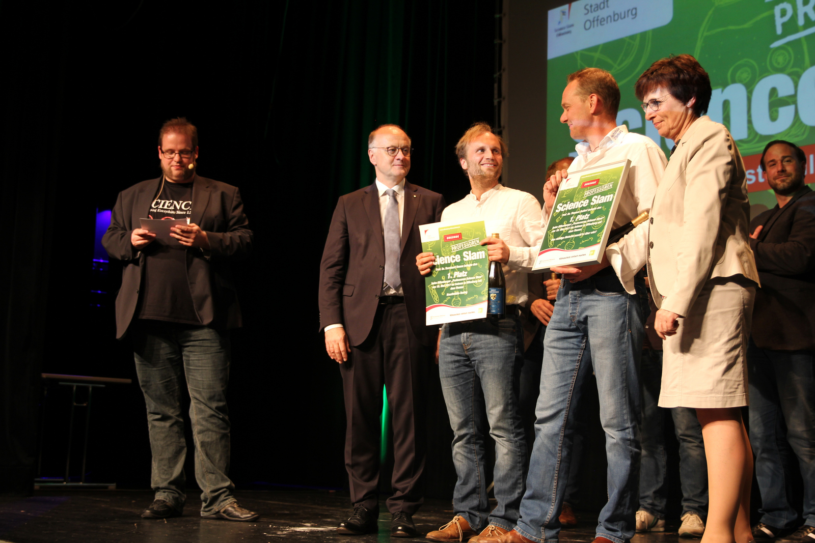 Der Sieg des Abends ging gleich an zwei Professoren: Prof. Dr. Bernhard Denne und Prof. Dr. Thomas Seifert lieferten nach Ansicht der Zuschauer die unterhaltsamsten Vorträge des Abends. Prof. Dr. Bernhard Denne, der technischen Vertrieb, Marketing und Wirtschaftsingenieurwesen lehrt, zog für seinen Vortrag über "Kreativitäts-Tuning" alle Register: Sogar seine beiden Söhne hatte er mit auf die Bühne gebracht. Seine Erklärung dafür: Kinder lösen die Probleme von Morgen, Erwachsen seien dazu nicht in der Lage, da ihnen die Kreativität verloren gegangen ist. Mit vielen Beispielen aus seiner beruflichen Praxis oder dem Privatleben erklärte er dem Publikum, warum man sich sowohl beim Joggen als auch auf dem stillen Örtchen Kreativitätszonen schaffen kann und sollte.