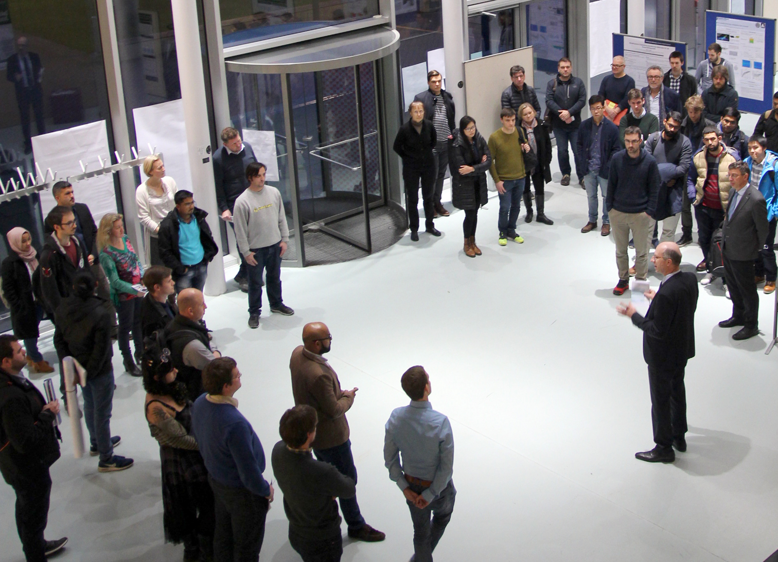 Im Anschluss an die Vorstellung der Graduate Academy standen die Doktorandinnen und Doktoranden im Mittelpunkt. Sie stellten in jeweils dreiminütigen Vorträgen den Inhalt und den Stand ihrer Promotionen vor. 26 Arbeiten aus den Bereichen Produktionstechnik, Optik, IT, Energie und Elektrotechnik konnten den Besuchern im Foyer des D-Gebäudes in einer Posterausstellung präsentiert werden.
