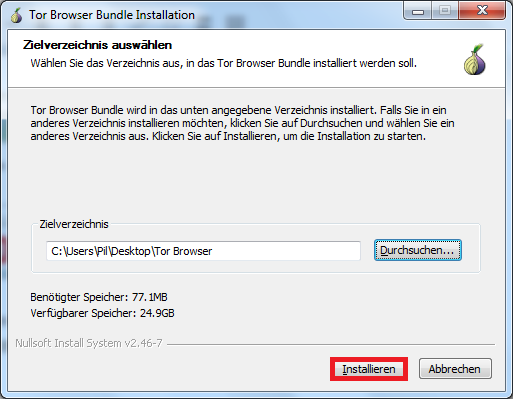Im nächsten Fenster kann das Zielverzeichnis der Installation angegeben werden. Wir lassen hier das Standard vorgegebene Verzeichnis. Gegebenenfalls hier mit dem Button “Durchsuchen” ein anderes Zielverzeichnis wählen und mit “Installieren” fortsetzen.