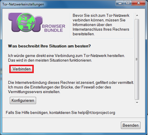 Tor öffnet sich nun automatisch und es können einige Einstellungen vorgenommen werden. Befinden Sie sich zuhause in Ihrem Privaten Netzwerk, werden normalerweise keine weiteren Verbindungseinstellungen zum Tor-Netzwerk notwendig sein, da die Verbindung nicht zensiert, gefiltert oder vermittelt wird.