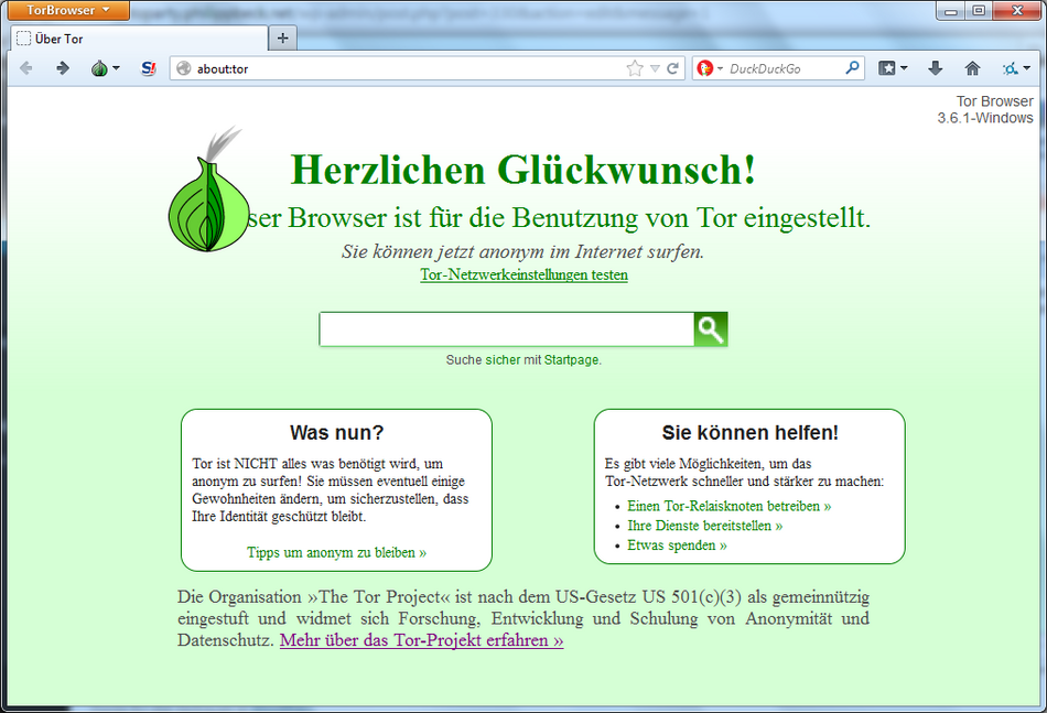 Nach erfolgreicher Verbindung mit dem Netzwerk, öffnet sich der Tor-Browser, mit dem nun Anonym im Internet gesurft werden kann.