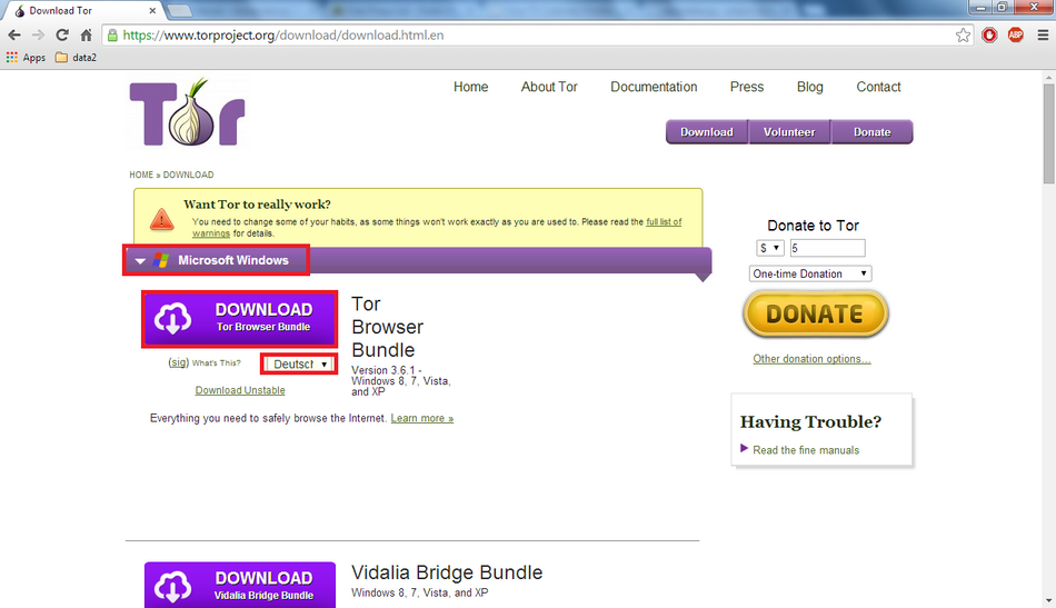 Dort wählt man dann je nach Betriebssystem das entsprechende Bundle mit der richtigen Sprache aus und lädt es herunter. In unserem Fall das “Tor Browser Bundle Version 3.6.1 – Windows 8, 7, Vista, and XP”.