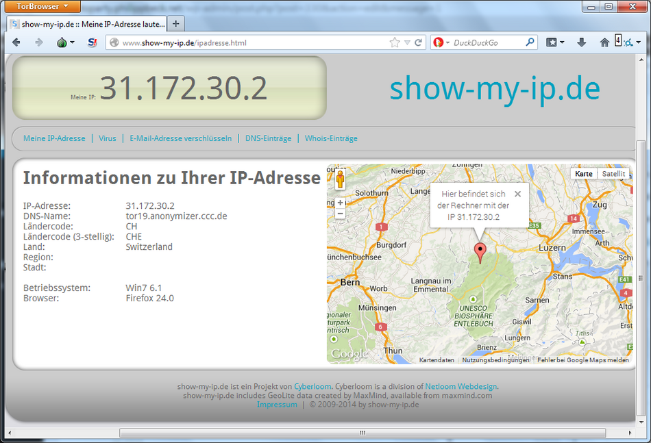 Nach einiger Zeit Aktualisieren wir die Webseite mit der Taste “F5″. Und Tatsächlich, erhalten wir nun folgende Informationen über unseren angeblichen Standort. Diesmal in der Schweiz mit der IP-Adresse 31.172.30.2.