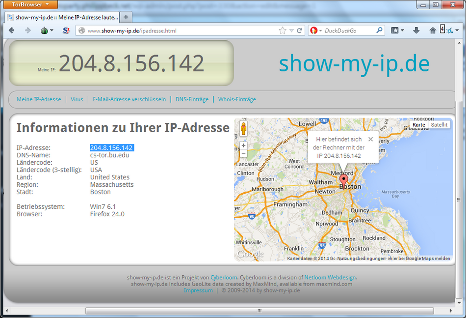Wir wollen gleich einen Test machen. Wie in der Tor Funktionsweise beschrieben, sollte meine IP-Adresse nicht nur eine andere sein, sondern auch alle 3 Minuten die IP-Adresse wechseln durch die unterschiedlichen Routen welche durch das Tor-Netzwerk gewählt werden. Dazu gehen wir auf die Seite www.show-my-ip.de. Dort bekommen wir Informationen zu unserer IP-Adresse 204.8.156.142 aus den USA in Boston.