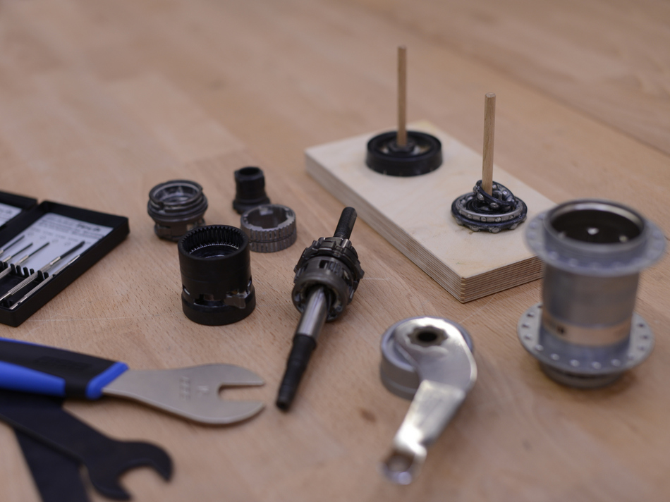 The focus of the experiment is a 3-gear bicycle hub that is dismantled and reassembled. In the disassembled state, the components relevant for the shifting are identified and their function is determined in conjunction with the other components. The students thus gain practical experience in the field of gears and translation.
