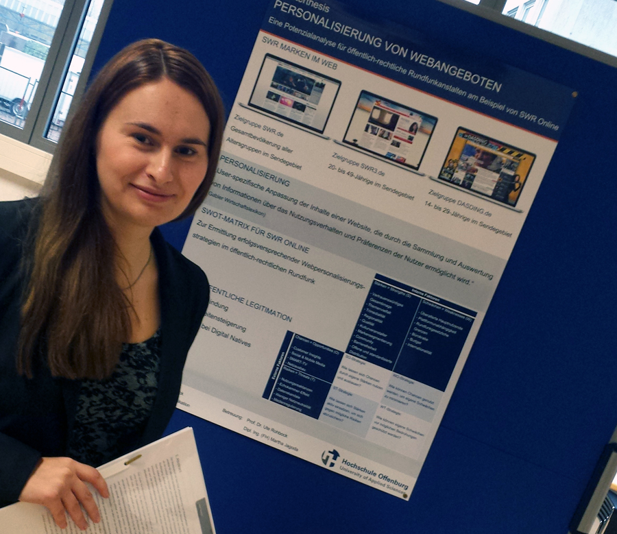 Franziska Schilli (Absolventin des Studienganges Medien und Informationswesen, betreut durch Studiendekanin Prof. Dr. Ute Rohbock) untersuchte beispielsweise Potenziale zur Integration innovativer E-Commerce Lösungen innerhalb der Möbelindustrie. Neben der selbstständigen Arbeit lobte sie die gute Betreuung und den engen Kontakt zur Professorenschaft innerhalb der Fakultät. Wie bereits in den vergangenen Jahren nutzten in diesem Semester zahlreiche interessierte Studierende, Professorinnen und Professoren, Mitarbeitende und Vertreter aus der Praxis die Gelegenheit sich einen Überblick über die vielfältigen und kreativen Abschlussarbeiten zu bekommen.