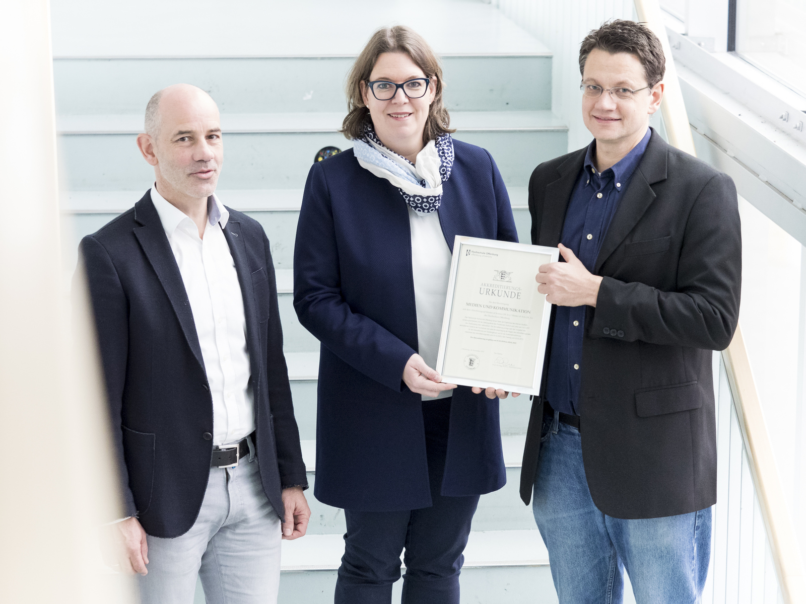 Die Mühe hat sich gelohnt: In den vergangenen Monaten wurde der Masterstudiengang Medien und Kommunikation (MuK) grundlegend überarbeitet. Heute überreichte Prorektorin Prof. Anne Najderek die Akkreditierungsurkunde für den neuen Studiengang. "Eine erfolgreich durchlaufene Akkreditierung ist ein wichtiges Zeichen, dass der Studiengang den geforderten Qualitätskriterien entspricht und einem regelmäßigem Qualitätssicherungsverfahren unterliegt", sagte Najderek: "Dies ist auch für die Studierenden ein wichtiges Zeichen, dass feste Qualitätsstandards Anwendung finden."