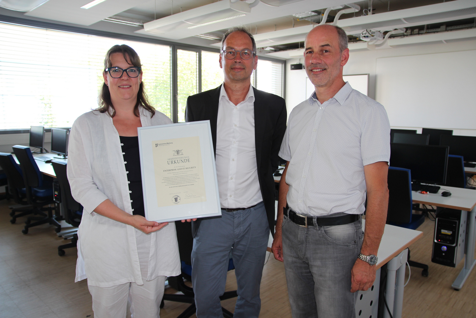 Prorektorin Prof. Dr. Anne Najderek überreicht Studiendekan Prof. Dr. Dirk Westhoff und Prof. Dr. Volker Sänger, Dekan der Fakultät für Medien und Informationswesen, die Akkreditierungsurkunde.