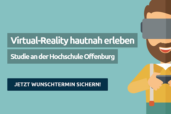 Studierende der Hochschule Offenburg können bei einer Studie hautnah Virtual-Reality-Anwendungen erleben. Unter den Teilnehmern wird ein Samsung Tablet verlost.