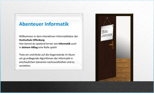 Eintreten und auf die Gegenstände im Raum klicken, um grundlegende Algorithmen der Informatik in anschaulichen Szenarien nachzuvollziehen und zu verstehen.
