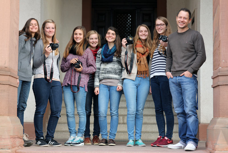 Die großen blauen Augen zeichnen sich auffällig von der schon etwas in die Jahre gekommenen Wand ab. "Die Perspektive gefällt mir richtig gut", sagt Patrick Zschörnig anerkennend in die Runde. Er studiert an der Hochschule Offenburg "Medientechnik/Wirtschaft-plus" (MW-plus), möchte nach dem Studium Lehrer werden. Seit Oktober bietet er eine Foto-AG am Gymnasium Ettenheim an - bis Ende Februar zeigt er den Schülerinnen und Schülern, die aus allen Klassenstufen kommen, wie Portraitfotografie funktioniert, wie sie die richtige Blende wählen, wann sie welche ISO-Zahl brauchen. Gerade besprechen sie in der AG die Portraitfotos der vergangenen Woche. Natalie, Carmen und Laura haben sich gegenseitig fotografiert, verschiedene Hintergründe ausprobiert. Das Bild, das Patrick Zschörnig gut gefällt, ist leicht von oben aufgenommen. "Eine besondere Perspektive ist immer wichtig", sagt der Student, dessen großes Hobby die Fotografie ist. Das nächste Bild ist leicht unscharf. Hier hat Patrick Zschörnig gleich einen Tipp: "Damit das Bild richtig scharf wird, solltet Ihr den Kehrwert der Brennweite nehmen - die Brennweite ist auf den Objektiven immer angegeben."