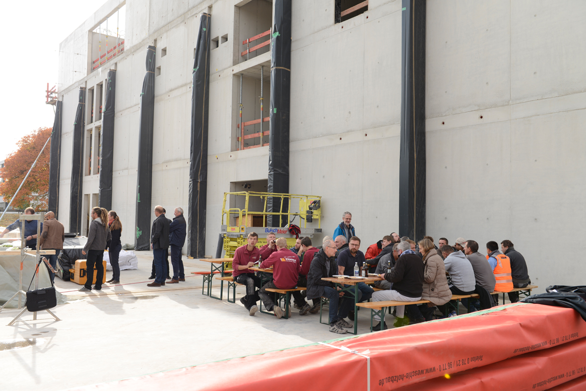 Mit einem gemeinsamen Mittagessen auf der Baustelle des RIZ Energie wurde am vergangenen Freitag ein Baufest gefeiert. Der Beton-Rohbau ist nun fast fertiggestellt und die Holzarbeiten beginnen gerade. Ein guter Anlass, den am Bau beteiligten Firmen für die bis heute geleistete Arbeit zu danken.