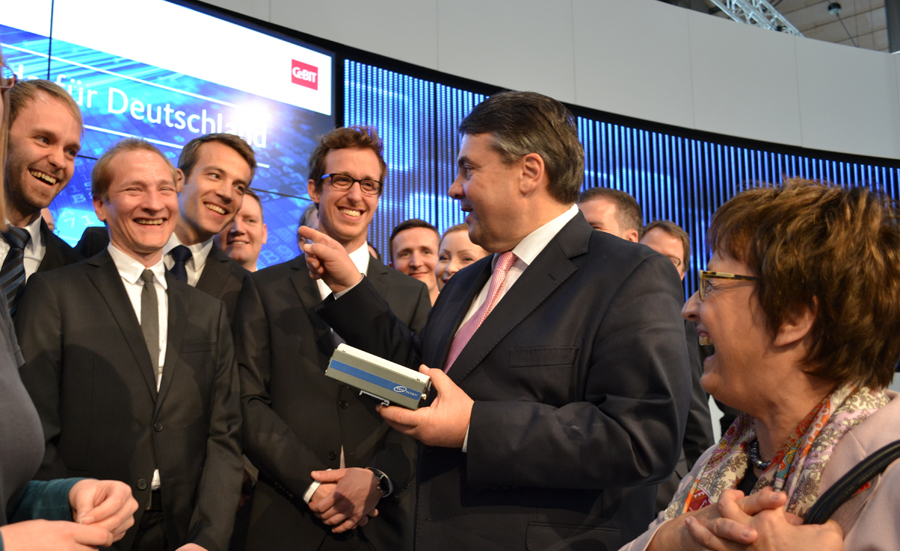 Das Enit-Team mit Sigmar Gabriel (von links): Simon Fey, Niels Schröter, Hendrik Klosterkemper, Kai Klapdor (im Hintergrund verdeckt: Pascal Benoit und Mehran Shakeri). // Bild: Carolin Vogt