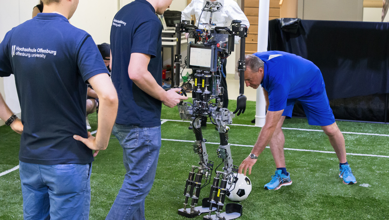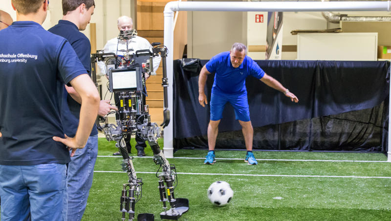 Martin Wagner, Ex-Nationalspieler, Deutscher Meister und DFB-Pokalsieger, hat den humanoiden Roboter Sweaty auf die Probe gestellt.