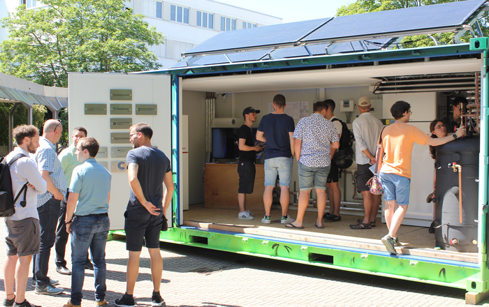 Der mit Hilfe von Studierenden der Hochschule Offenburg zum energieautarken Infostand für erneuerbare Energien umgebaute Seecontainer kann…
